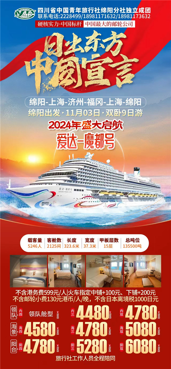 綿陽中旅假日旅行社于2024年10月9日在市工會(huì)大廈成功舉行“愛達(dá)·魔都號(hào)豪華郵輪9日游”旅游線路推薦會(huì)?,F(xiàn)場主持人向到場的嘉賓們?cè)敿?xì)的介紹了濟(jì)州、福岡等地的風(fēng)土人民、美食、美景以及出游的相關(guān)注意事項(xiàng)等內(nèi)容,受到了嘉賓們的熱烈歡迎和關(guān)注。服務(wù)熱線:0816-2228499/2238477 。